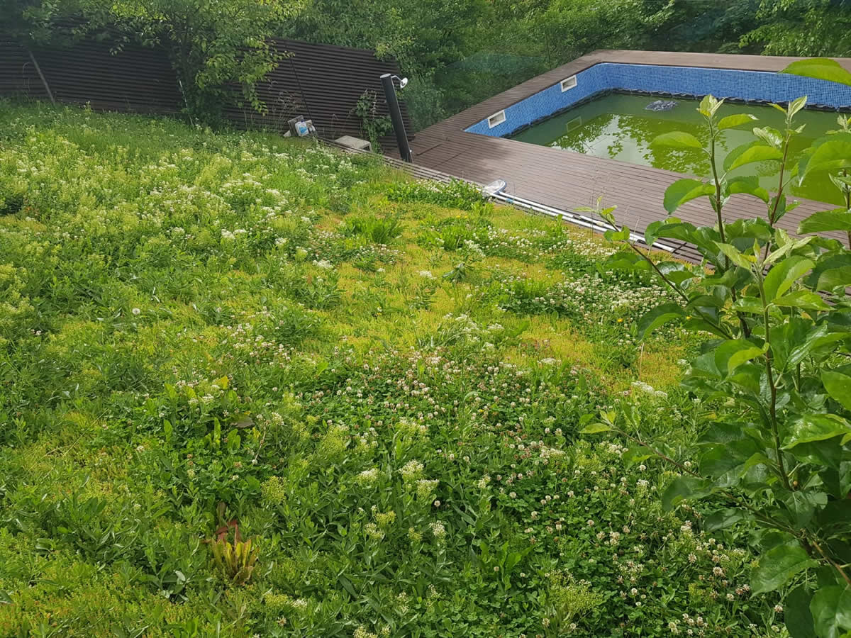 References Residential Biodiverse roof with swimming pool 1 min read 0 35 The green roof, rich in biodiversity, creates a lush landscape even when designed on a slope, adding volume and architectural character. Located next to the swimming pool, this planted area creates a natural, elegant, and relaxing atmosphere, transforming the entire space into a refined retreat. Each green roof system we design and build offers the best cost–efficiency–operational safety ratio, providing green terrace system solutions tailored to the specific requirements of your project. We are at your service with design services, system solutions, green roof cost estimates, and professional consultancy.